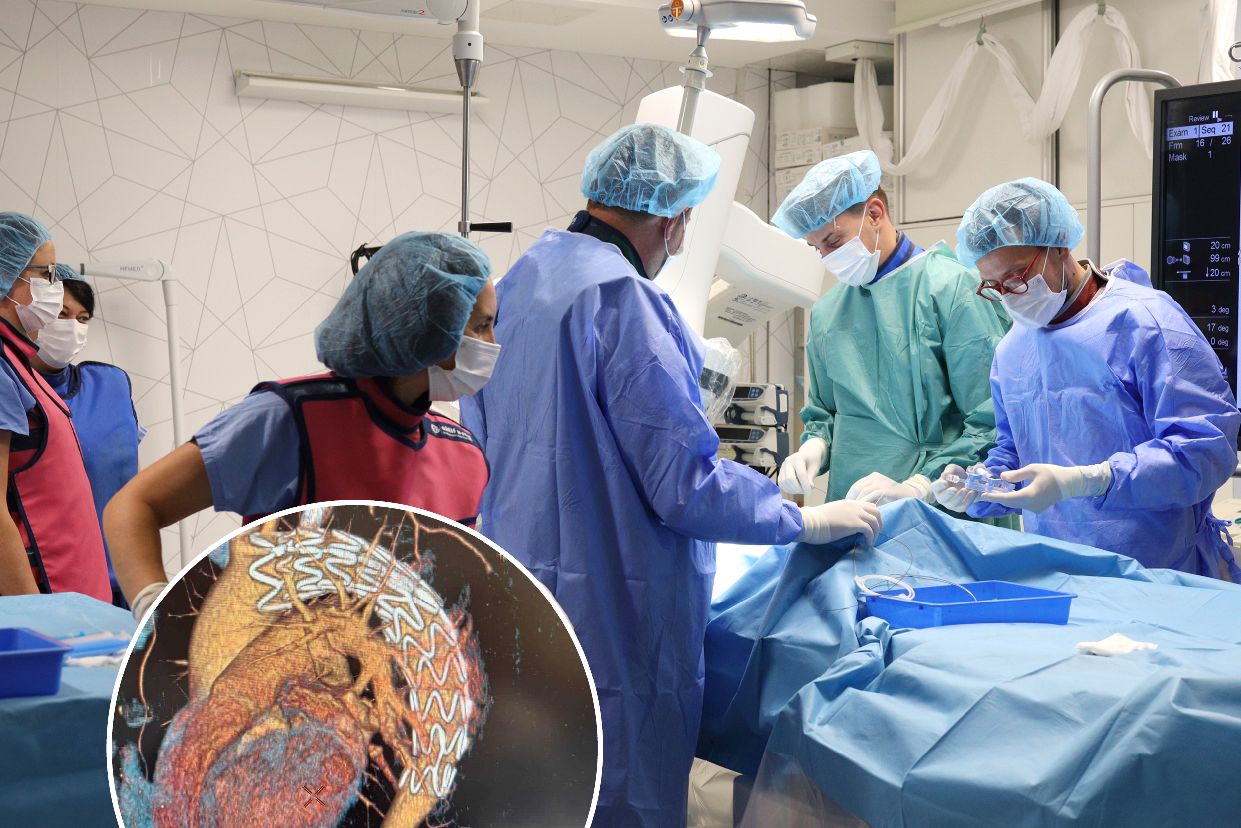 Комплексноста на ваквата интервенција бара вклученост на цел тим стручни лекари и среден медицински персонал, кој е посебно обучен за ендоваскуларни и хибридни процедури. Оваа интервенција ја изведе дел од тимот за кардиоваскуларни доктори од КБ „Аџибадем Систина“ предводен од д-р Никола Лазовски (васкуларен хирург) и доц. д-р Александар Ѓорески (интервентен радиолог), а во тимот за оваа комплексна процедура беа и: доц. д-р Менка Лазареска (интервентен радиолог), д-р Димитар Јосифовски (специјализант по кардиохирургија), д-р Лихнида Матевска, (кардиоанестезиолог), с. Ирена Апостолов (кардиоанестетичар), с. Зорица Урдаревиќ (сестра во ангио-сала) и Дарко Марковиќ (радиолошки технолог).